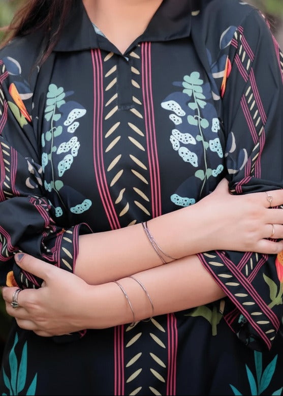 Refresh your everyday elegance with this Black Digital Printed 2-Piece Suit, featuring vibrant floral and botanical motifs. The beautifully printed kurta showcases a balanced blend of traditional inspiration and modern design, while the matching straight-cut trouser completes the look with effortless grace. Crafted from comfortable, breathable fabric, this ensemble is perfect for casual outings, daytime gatherings, and stylish everyday wear. The rich black base enhances the colorful prints, making it a standout addition to your wardrobe.