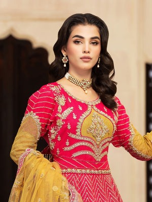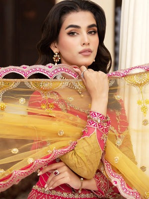Step into elegance with this beautifully crafted Pink Organza Flared Pishwas 3-Piece Ensemble, designed to bring grace, charm, and effortless sophistication to your wardrobe.