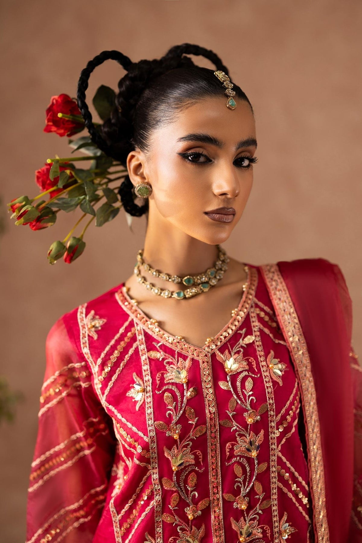 Step into bold elegance with Shaan, a vibrant fuchsia 3-piece organza ensemble designed for the confident woman. The handworked organza kurta is adorned with exquisite dabka, naqshi, and sequins, creating a show-stopping look that shines at every festive occasion.