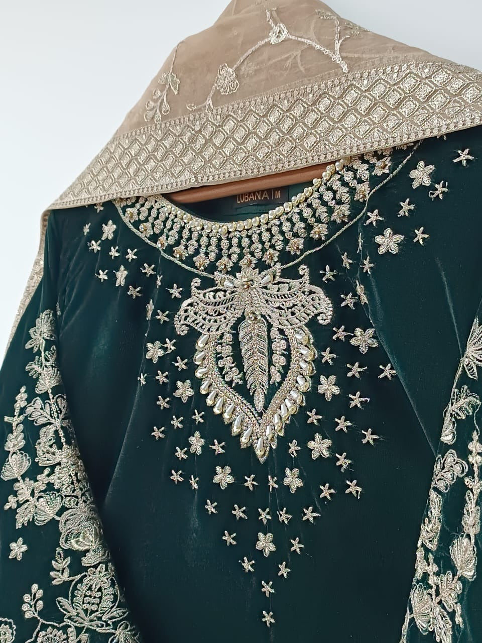 A beautifully detailed 35–36 inch velvet shirt adorned with intricate embroidery for a striking, elegant finish.