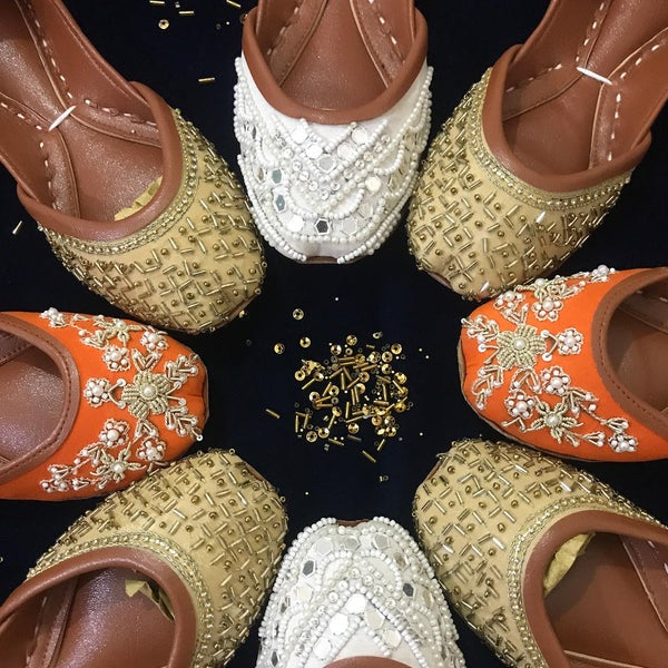 Give your little one the perfect blend of comfort, tradition, and elegance with this Handmade Kids Khussa in Poppy Orange. Beautifully handcrafted by skilled artisans, this pair features exquisite adda work using light gold kora, dabka, naqshi, pearls, and delicate golden tilla, making it a charming statement piece for any festive or formal occasion.